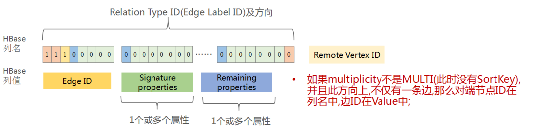 HBase的列名只存储Property Key的ID及方向。具体的Property Value值以及Property ID(JanusGraph为每一个Property分配的唯一ID),都存放在Cell的Value中。另外,如果该Property还有额外的Remaining properties,也会放在Value中。Remaining properties一般不使用,仅在一些特殊场景下,用于为该Property记录更多的附加信息(比如存储元数据Edge Labe的定义等)。