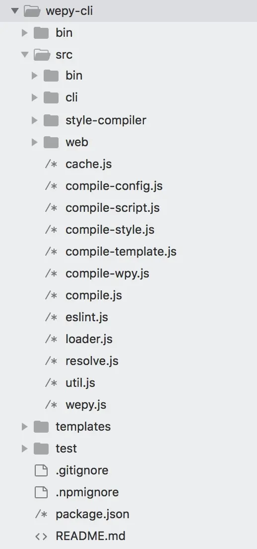 wepy-cli 主要负责 .wpy 文件的编译,目录结构如下: