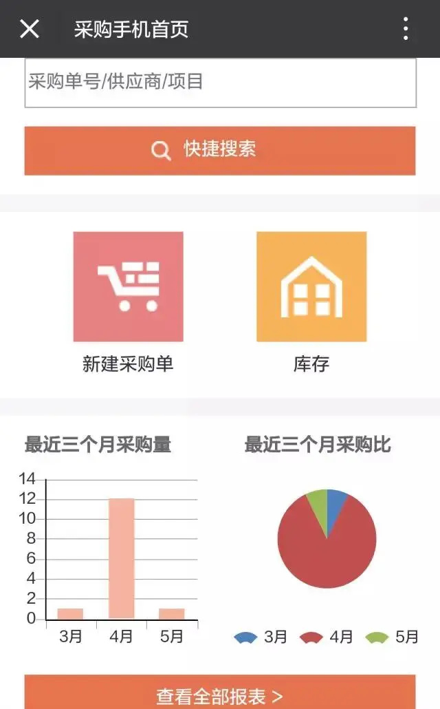 销售:管理销售情况,可对订单进行查询、打印、出库等 库存报表:支持采购报表、出入库报表、销售报表等