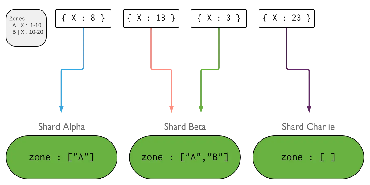 每个区域包括一个或多个范围的shard key。每个区域的覆盖范围总是包容它的下边界和排它的上界。