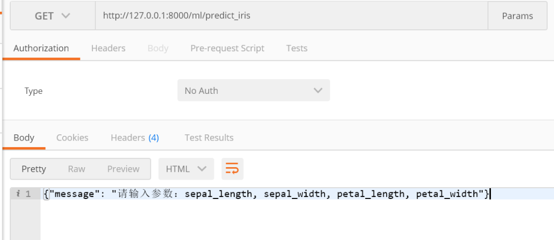 在 PostMan(也可以在浏览器中打开) 中打开 http://127.0.0.1:8000/ml/predict_iris ,得到以下结果: