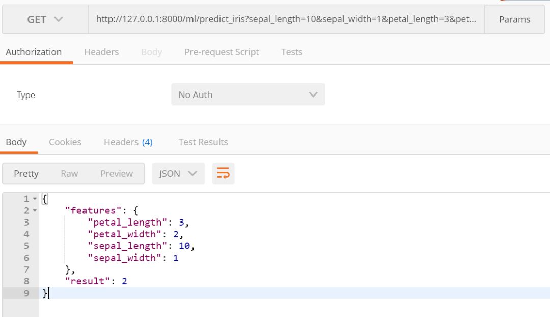可以看到,这里提示我们输入 sepal_length, sepal_width, petal_length, petal_width 参数,所以我们需要添加上参数重新构造一个请求 url:http://127.0.0.1:8000/ml/predict_iris?sepal_length=10&sepal_width=1&petal_length=3&petal_width=2