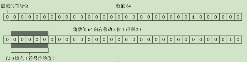 //例如,把 64 右移 5 位,将变为 2: