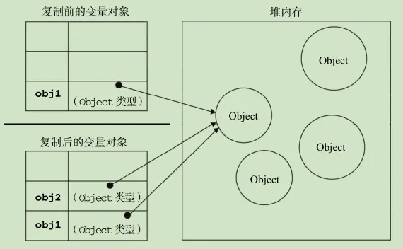- 当从一个变量向另一个变量复制引用类型的值时,同样也会将存储在变量对象中的值复制一份放到为新变量分配的空间中。不同的是,这个值的副本实际上是一个指针,而这个指针指向存储在堆中的一个对象。复制操作结束后,两个变量实际上将引用同一个对象。因此,改变其中一个变量,就会影响另一个变量