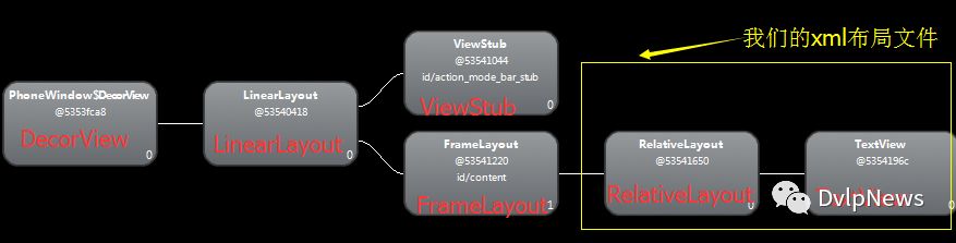 看见了吧,通过这个App的hierarchyviewer和系统screen_simple.xml文件比较就验证了上面我们分析的结论,不再做过多解释。