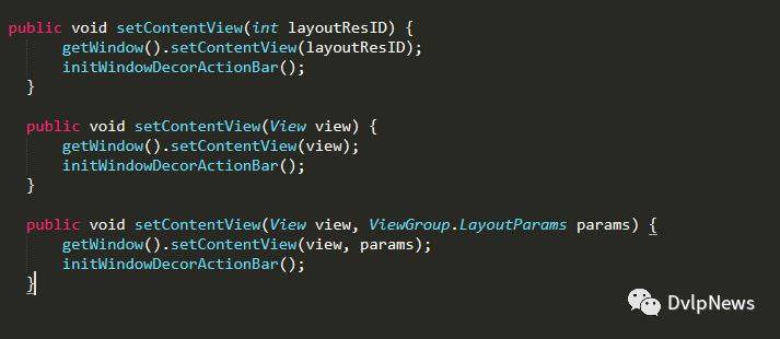 可以看见他们都先调运了getWindow()的setContentView方法,然后调运Activity的initWindowDecorActionBar方法,关于initWindowDecorActionBar方法后面准备写一篇关于Android ActionBar原理解析的文章,所以暂时跳过不解释。