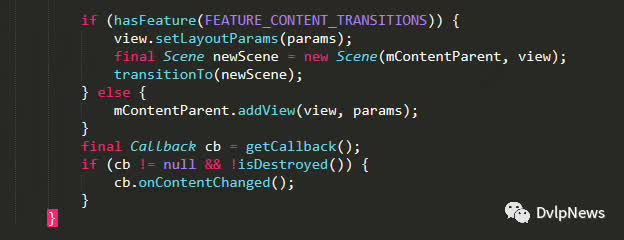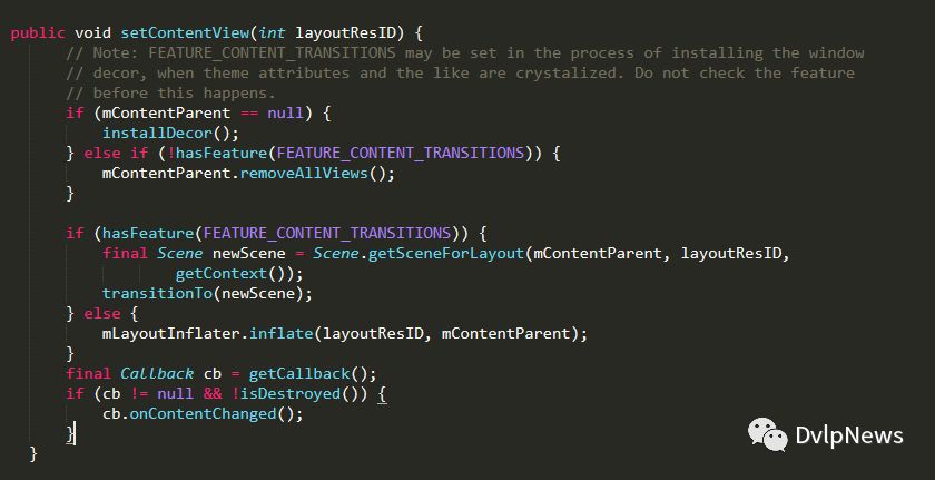 上面刚刚说了PhoneWindow类的setContentView方法中最后调运了onContentChanged方法。我们这里看下setContentView这段代码,如下: