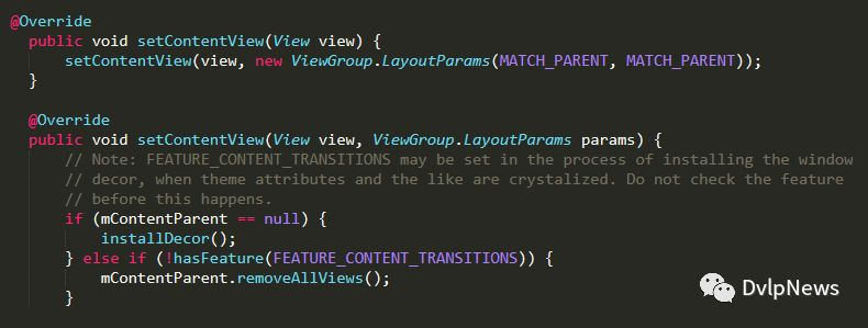 看见没有,我们其实只用分析setContentView(View view, ViewGroup.LayoutParams params)方法即可,如果你在Activity中调运setContentView(View view)方法,实质也是调运setContentView(View view, ViewGroup.LayoutParams params),只是LayoutParams设置为了MATCH_PARENT而已。