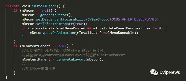 回过头,我们继续看上面PhoneWindow类setContentView方法的第6行installDecor();代码,在PhoneWindow中查看installDecor源码如下: