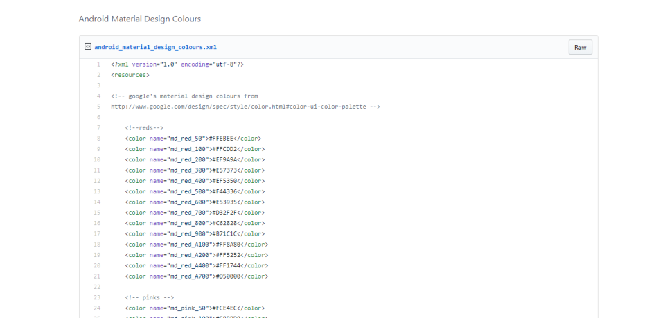 这是Github上面的网友提供的安卓材料颜色代码。每个主色调下面都涵盖了各种不同色调的颜色代码。直接复制粘贴即可使用,节省了不少时间。