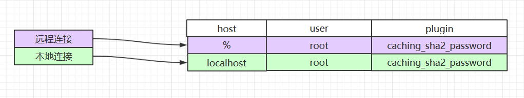 注意到第4行数据 host='%' AND user ='root',认证方式(plugin)就是caching_sha2_password,远程连接匹配这一行生效。字段authentication_string 存放的是加密后的字符串。