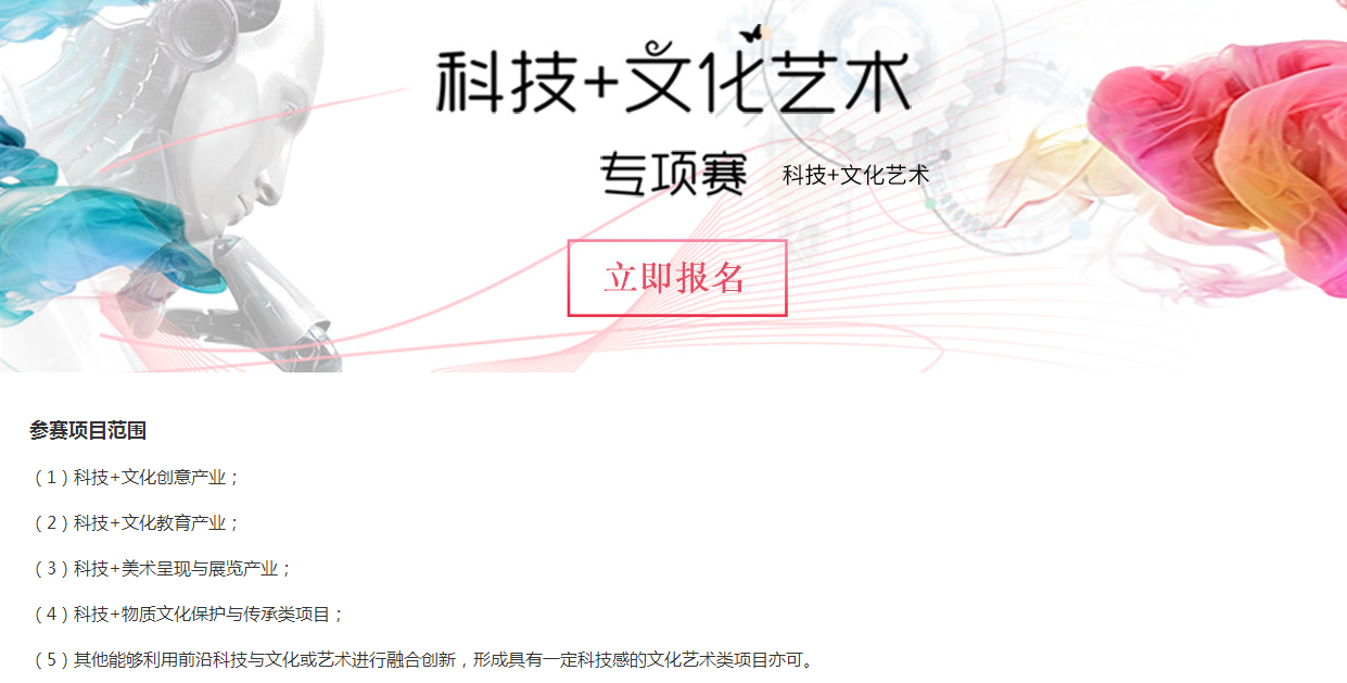 新兴科技+互联网创新大赛,科技+文化艺术专项赛介绍 13823152087 2018-05-12 136 阅读1分钟 互联网产业模式专项赛: 参赛项目范围 (1)科技+文化创意产业; (2)科技+文化教育产业; (3)科技+美术呈现与展览产业; (4)科技+物质文化保护与传承类项目; (5)其他能够利用前沿科技与文化或艺术进行融合创新,形成具有一定科技感的文化艺术类项目亦可。 参赛人群范围 联系组委会 大赛报名联系:13823152087 郑先生 参赛报名网站:http://www.chuangcheng.org.cn/24