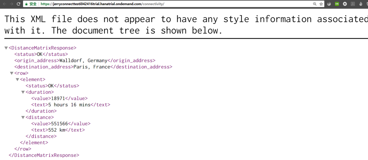 在浏览器里访问这个url,得到输出:从Walldorf到Berlin的距离。