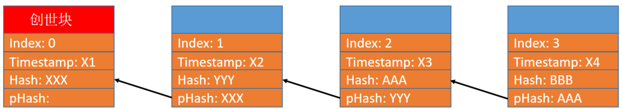 下图和我们在大学计算机专业课《数据结构》里学到的单链表很像。在这个版本里,每个区块包含了最基本的字段:块索引,块的创建时间戳,当前块的哈希值(hash)和前一块的哈希值。每个区块的pHash字段存储了前一块的哈希值,这样就构成了一个链表。链表的第一个节点,就是下图最左边红色抬头的区块为创世块,其索引为0,pHash字段为空。