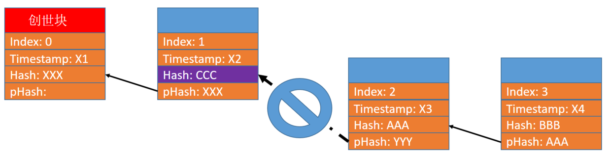 因为第21行set_data方法修改了第一个区块的内容后,会触发其哈希值的重新计算。这样第一个区块的哈希发生了变化(假设从YYY变到了CCC),而第二个区块的pHash仍然指向第一个区块变化之前的旧哈希值YYY,因此这个区块链被判定为无效。