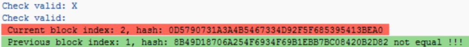 上图的输出来自校验方法is_valid: 遍历链里每个区块,比较区块里存储前一区块哈希值的字段pHash和位于该区块前一个位置的区块的哈希值是否一致。