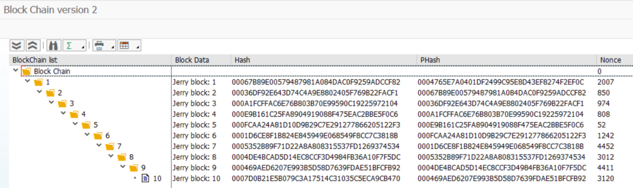 仔细观察第一版测试程序的树状输出,可以看到每个区块的哈希值没有任何规律。而第二版的这个输入参数就是为了提高哈希值的计算成本,即只有当计算出来的哈希值满足一定规则时,该哈希值才能被区块链所接受。参数iv_difficulty定义了能够被接受的哈希值的前导零个数。