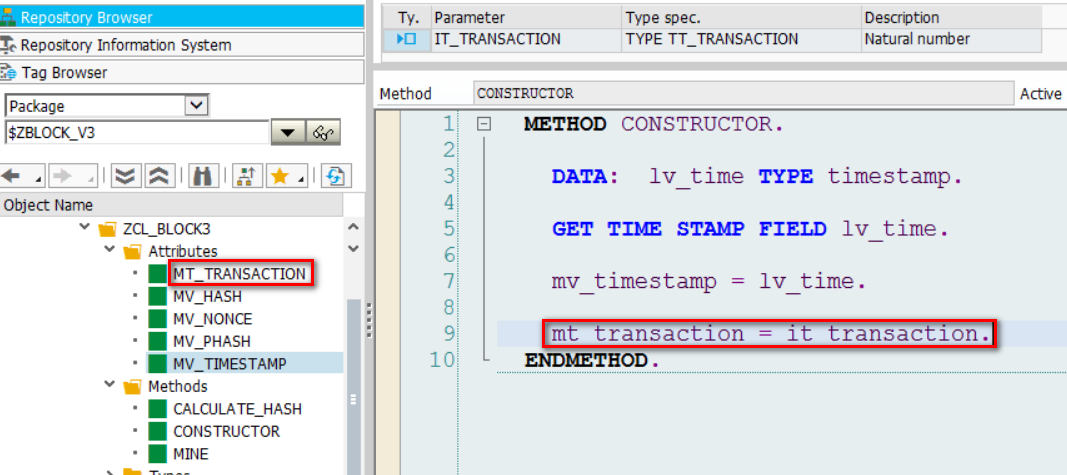 在这一版本里,首先被增强的是ZCL_BLOCK3: 去掉了前两个版本使用的mv_index和mv_data字段,增加了一个字段mt_transaction, 存储的是交易的集合。