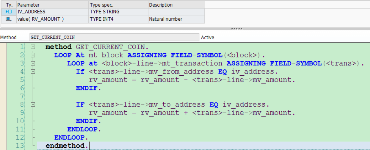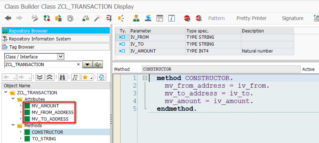 使用ZCL_TRANSACTION来代表一笔交易,包含三个字段:mv_from_address(支付方),mv_to_address(收款方)和mv_amount(交易金额)。