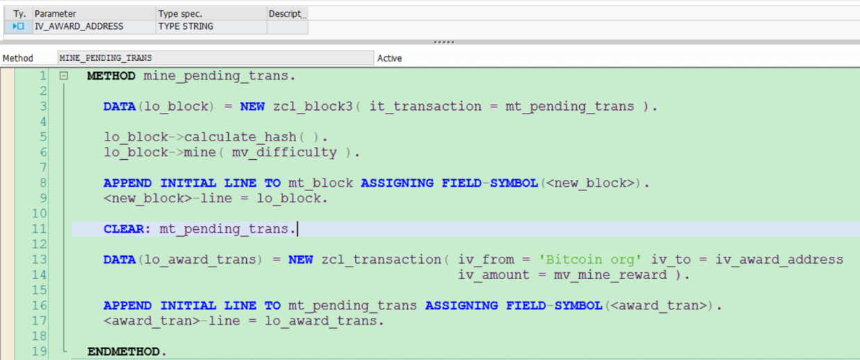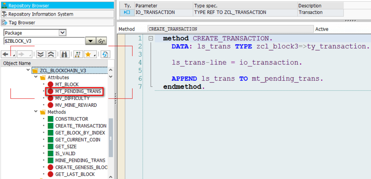 类ZCL_BLOCKCHAIN_V3增加了一个新的成员变量mt_pending_trans。每次调用方法create_transaction,并不会创建一个新的区块用于记录该条交易,只是简单地把该条交易添加到待处理任务队列mt_pending_trans里。