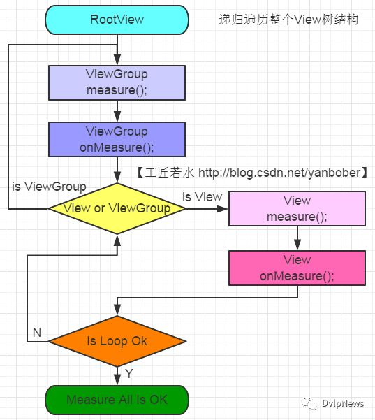 通过上面分析可以看出measure过程主要就是从顶层父View向子View递归调用view.measure方法(measure中又回调onMeasure方法)的过程。具体measure核心主要有如下几点: