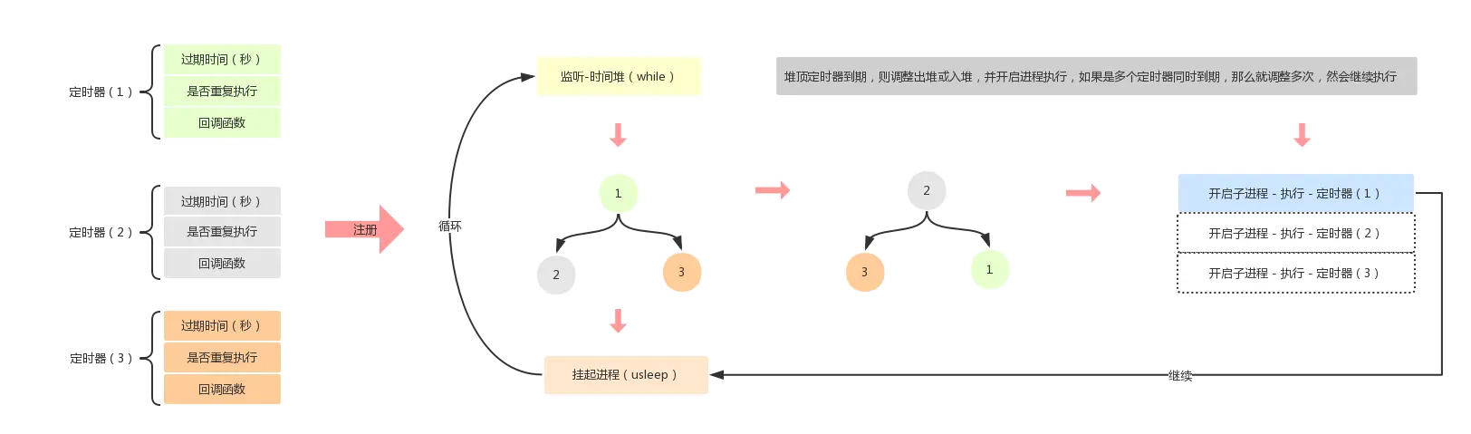 也测试过比较极端的情况,同时1000个定时器1s全部到期,时间堆全部调整完仅需 0.126s 这是没问题的,但是每调整完一个定时器就需要去开启一个子进程,这块可能比较耗时了,有可能1s处理不完这1000个,就会影响下次监听继续触发,但是不开启子进程,比如直接执行应该还是可以处理完的。。。。当然肯定有更好的方法,目前只能想到这样。