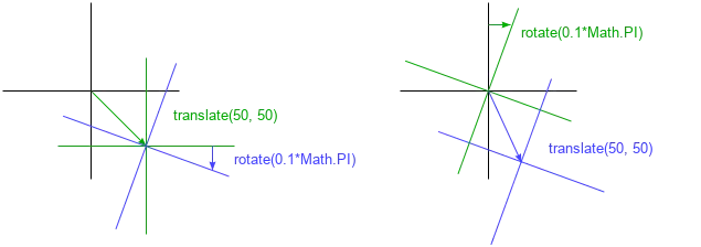 图形变换允许你向多个方向绘制图片。2D 绘制上下文拥有一个当前的可以通过translate、scale与rotate进行变换。这些会影响所有的后续的绘制操作。一个变换的状态可以通过save方法来保存,通过restore方法来恢复。