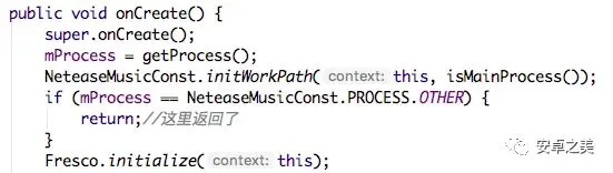 这样问题就清晰了,原来是Fresco.initialize方法虽然写在onCreate里面,但在这个机器上面onCreate执行在判断主进程的条件上面返回了,导致后面代码没有执行,大概是下面这个意思: