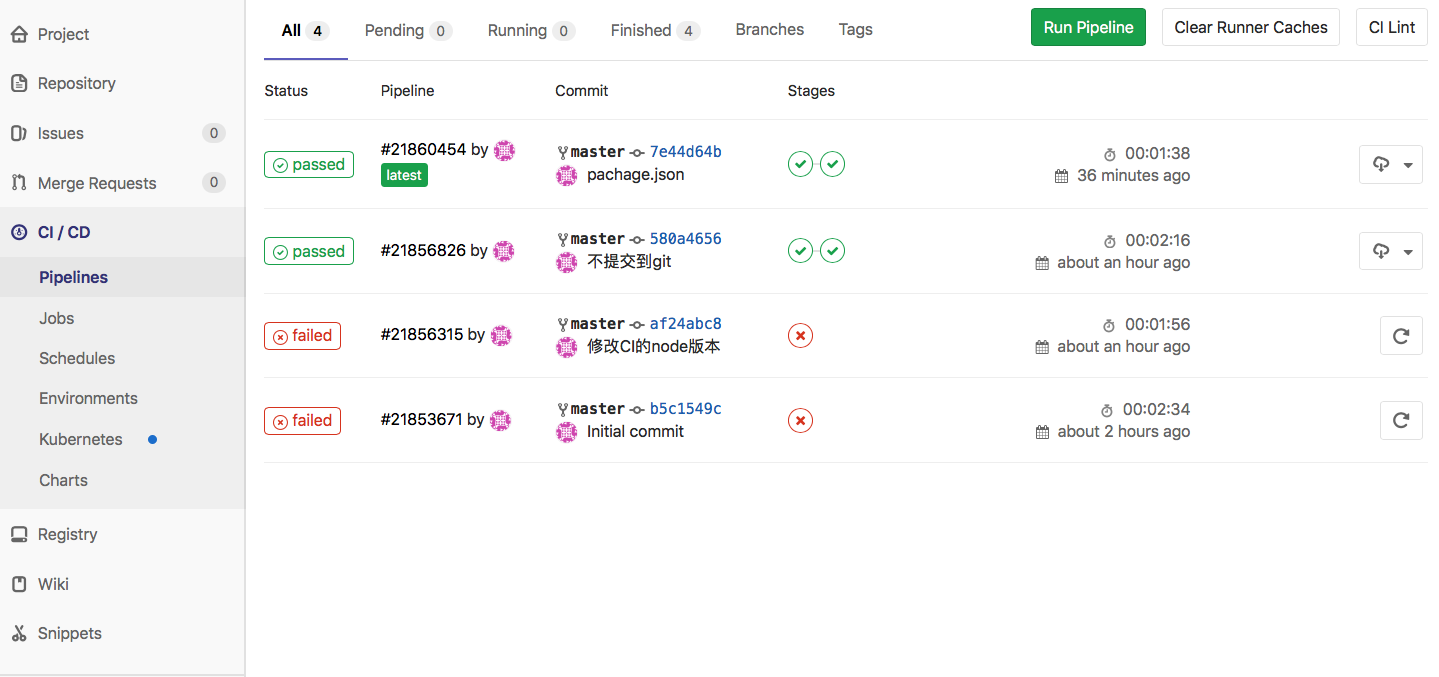 查看gitlab中项目的CI/CD -> Piplines,这时候应该处于Padding状态,等几分钟,状态变成了Success。