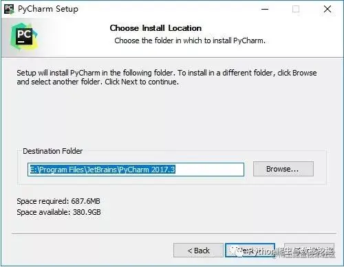 4、选择安装目录,Pycharm需要的内存较多,建议将其安装在D盘或者E盘,不建议放在系统盘C盘:
