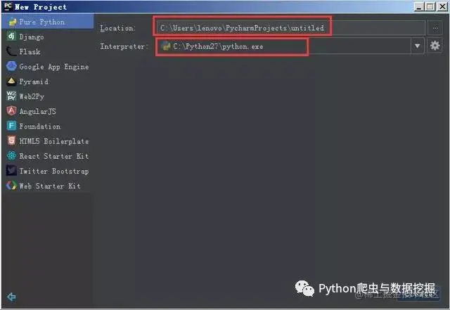 自定义项目存储路径,IDE默认会关联Python解释器。选择好存储路径后,点击create。