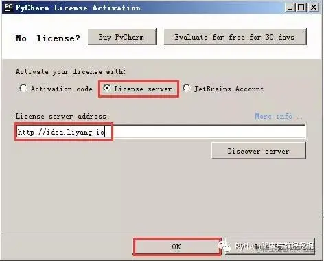 之后在License server address中随意输入下面两个注册码中的任意一个即可,Pycharm新注册码1:idea.liyang.io或pycharm新注册码2:xidea.online,之后点击OK,便可以激活Pycharm了。