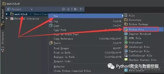 18、进入的界面如下图所示,鼠标右击图中箭头指向的地方,然后选择New,最后选择python file,在弹出的框中填写文件名(任意填写),本例填写:helloworld。
