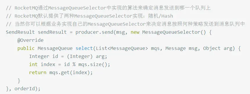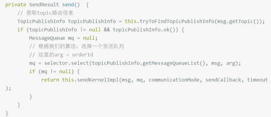 在获取到路由信息以后,会根据MessageQueueSelector实现的算法来选择一个队列,同一个OrderId获取到的肯定是同一个队列。