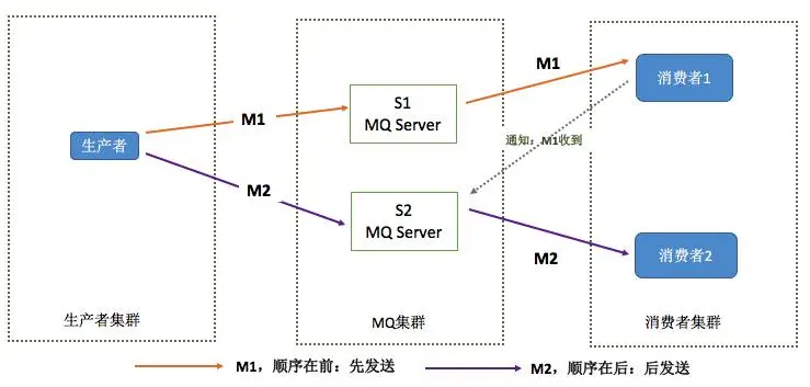 假定M1发送到S1,M2发送到S2,如果要保证M1先于M2被消费,那么需要M1到达消费端被消费后,通知S2,然后S2再将M2发送到消费端。
