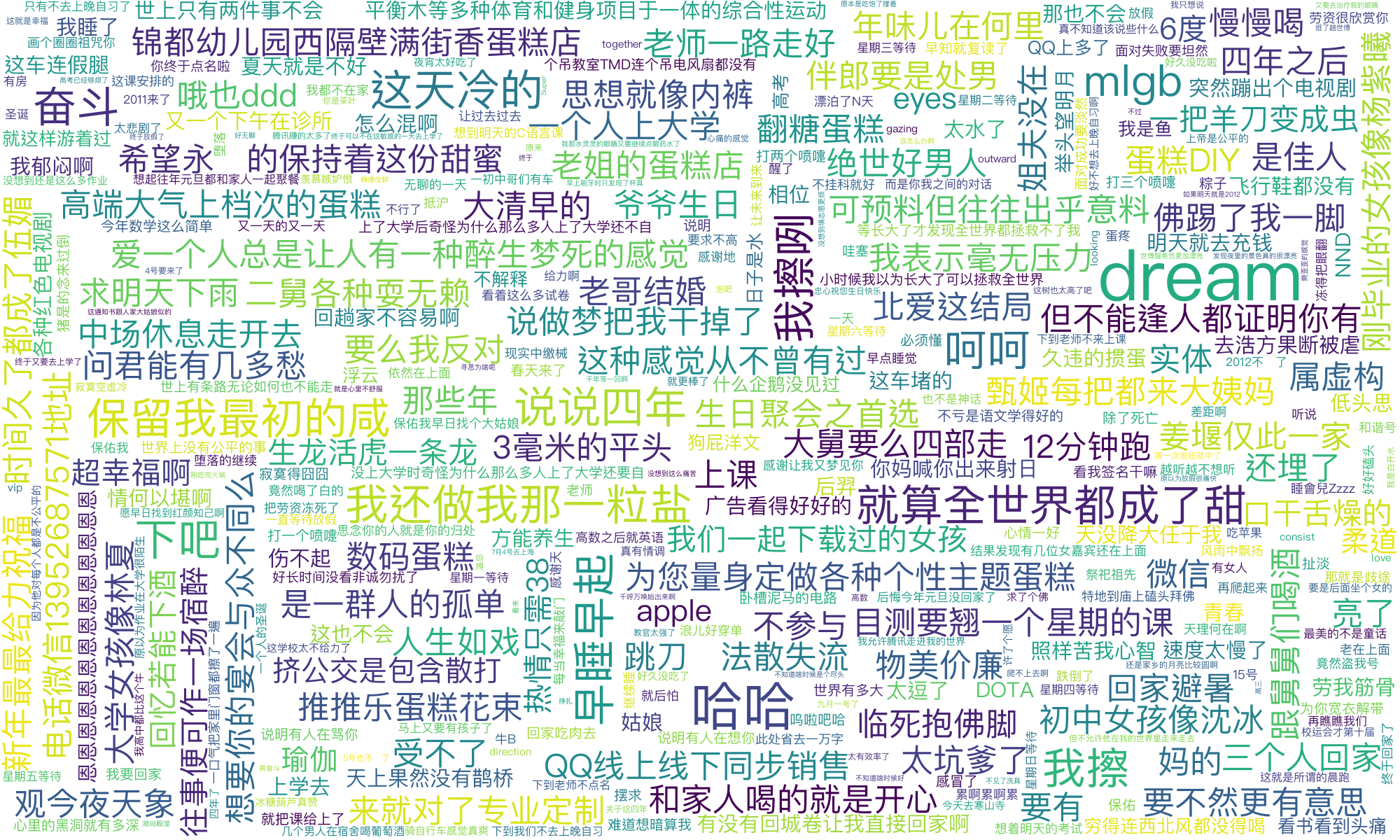 这里还可以使用jieba分词,我并没有使用,因为我觉得qq说说的句子读起来才有点感觉,个人喜好,用jieba分词可以看到说说高频次的一些词语。