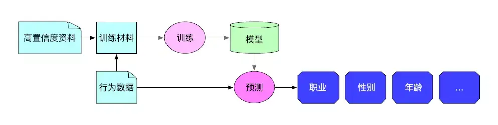 选取高置信度资料(如用户注册信息)和用户行为数据作输入进行模型训练。然后使用训练好的模型进行属性预测。