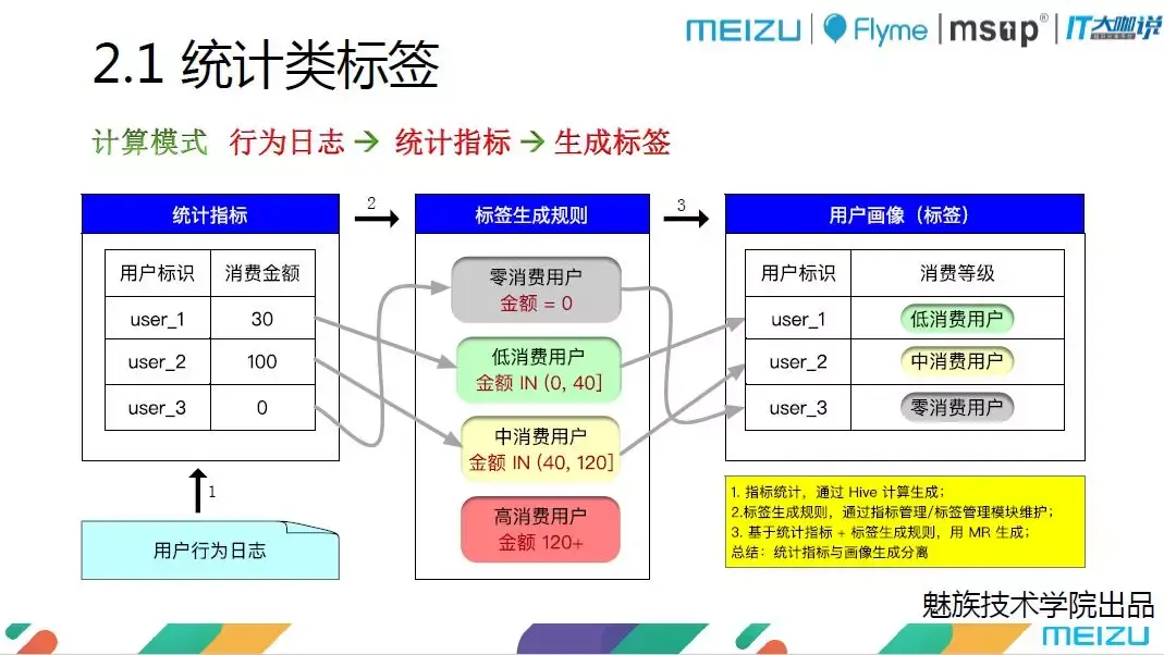 根据生成计算的过程,标签分为两类,其中一类是统计类标签。首先从用户的行为里统计出指标,然后根据标签生成规则和统计指标作为输入,就可以对应到哪个用户属于什么消费等级。