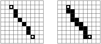 两个像素之间的直线是连接像素的链条,从起点到终点尽可能直。对角线相邻的像素也算作连接。 所以斜线应该看起来像左边的图片,而不是右边的图片。