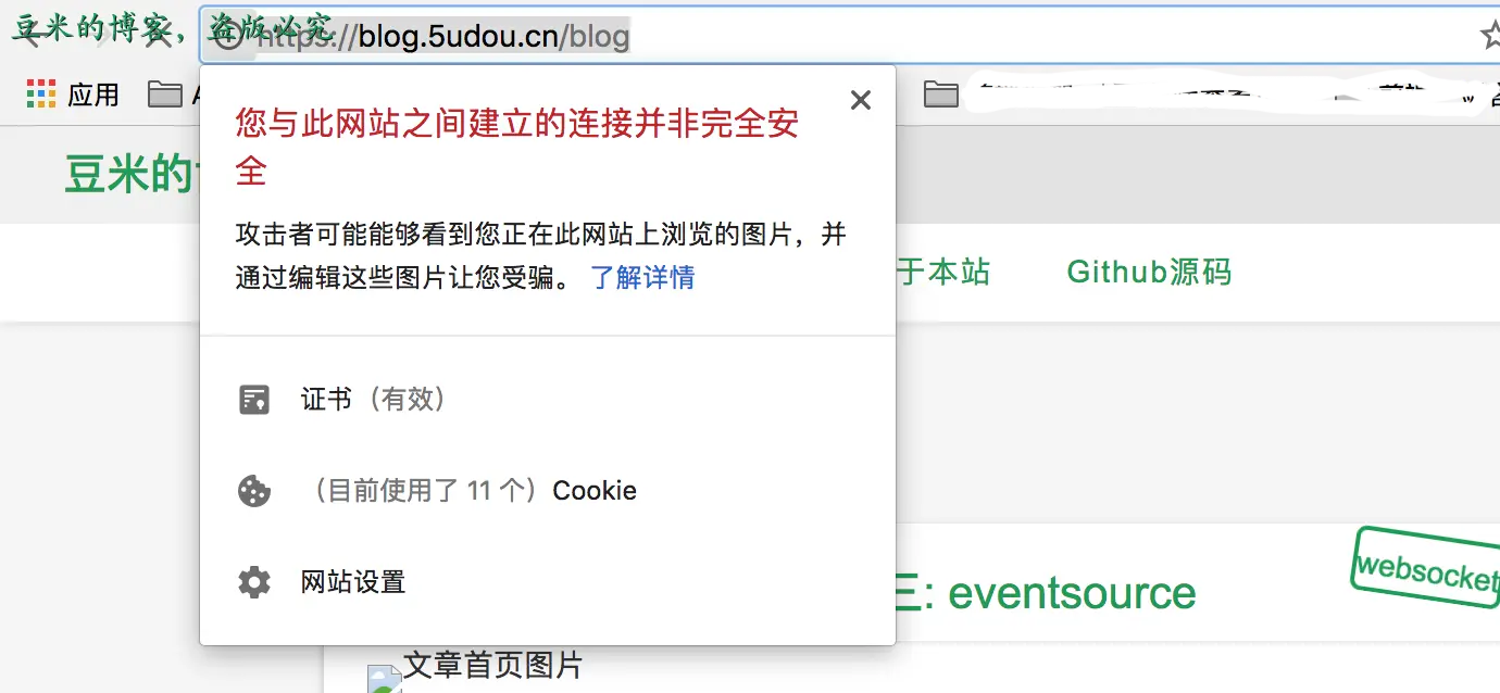 第一个问题是因为,有部分图片引用了http,所以我们只需要把博客文章所有用到的图片全改为https即可。然后发现百度分享竟然不支持https,果断干掉百度分享的SDK代码,鄙视百度一下下~~~