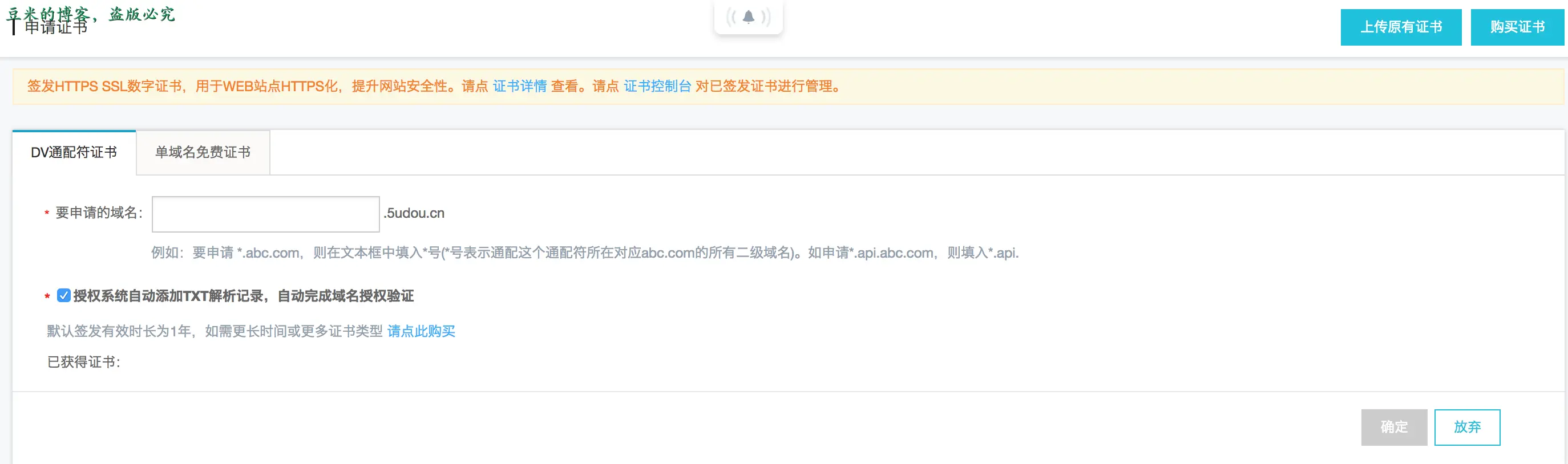 一下子发现自己的nginx有个配置错误,www.blog.5udou.cn是一个错误的域名,我的主域名是5udou.cn,所以二级域名blog.5udou.cn,并不存在www.blog.5udou.cn,可见Certbot是会去校验所有域名的合法性的。