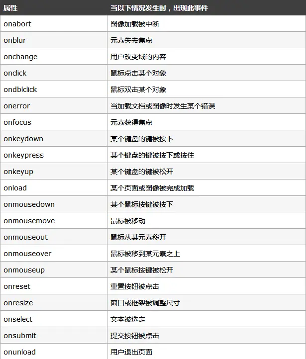 HTML 4.0 的新特性之一是有能力使 HTML 事件触发浏览器中的动作(action),比如当用户点击某个 HTML 元素时启动一段 JavaScript。下面是一个属性列表,这些属性可插入 HTML 标签来定义事件动作。