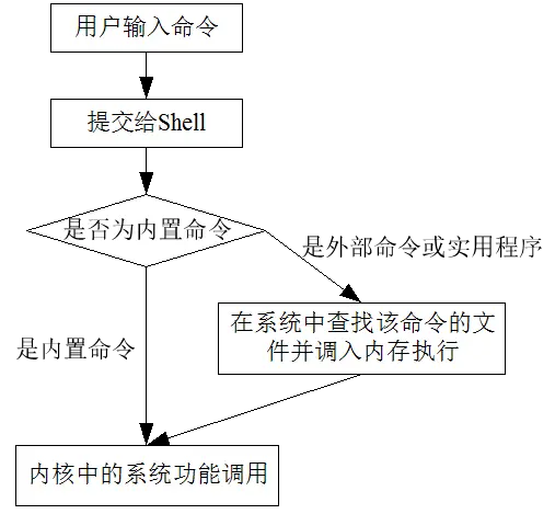 - 内置命令:出于效率的考虑,将一些常用命令的解释程序构造在Shell内部。