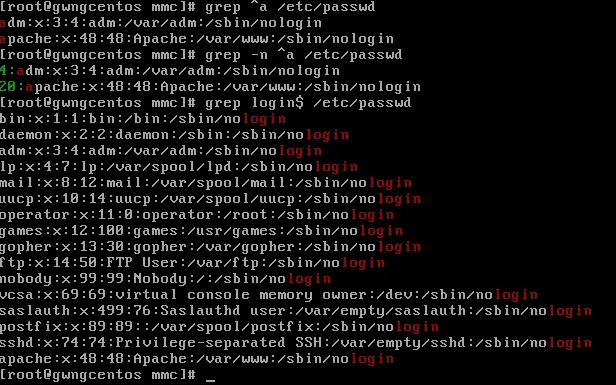 用grep查找/etc/passwd文件中以a开头的行,要求显示行号;查找/etc/passwd文件中以login结束的行;