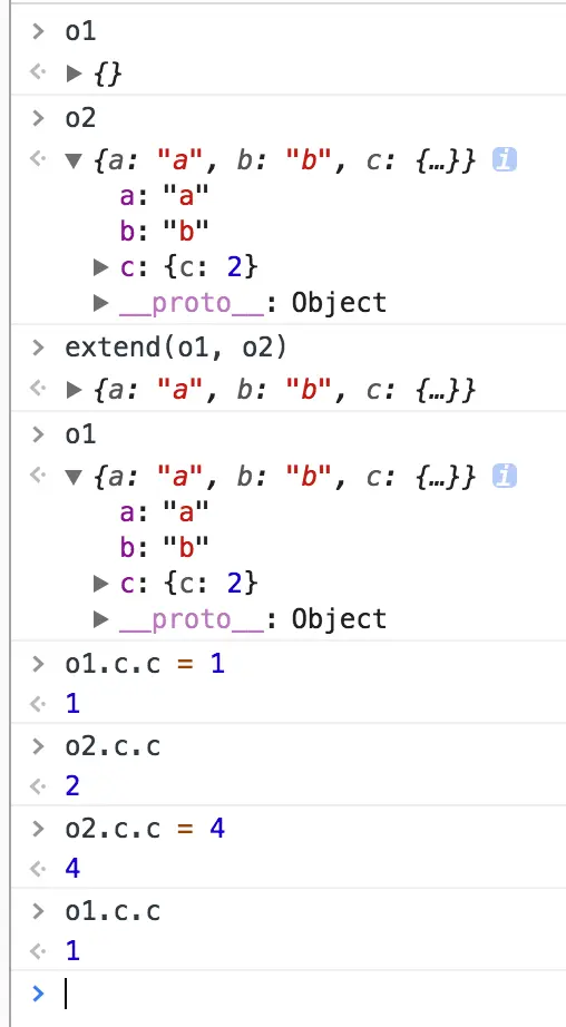 在控制台上执行下面代码,extend函数在实现Object.assign的功能的同时,也实现了对对象的深复制