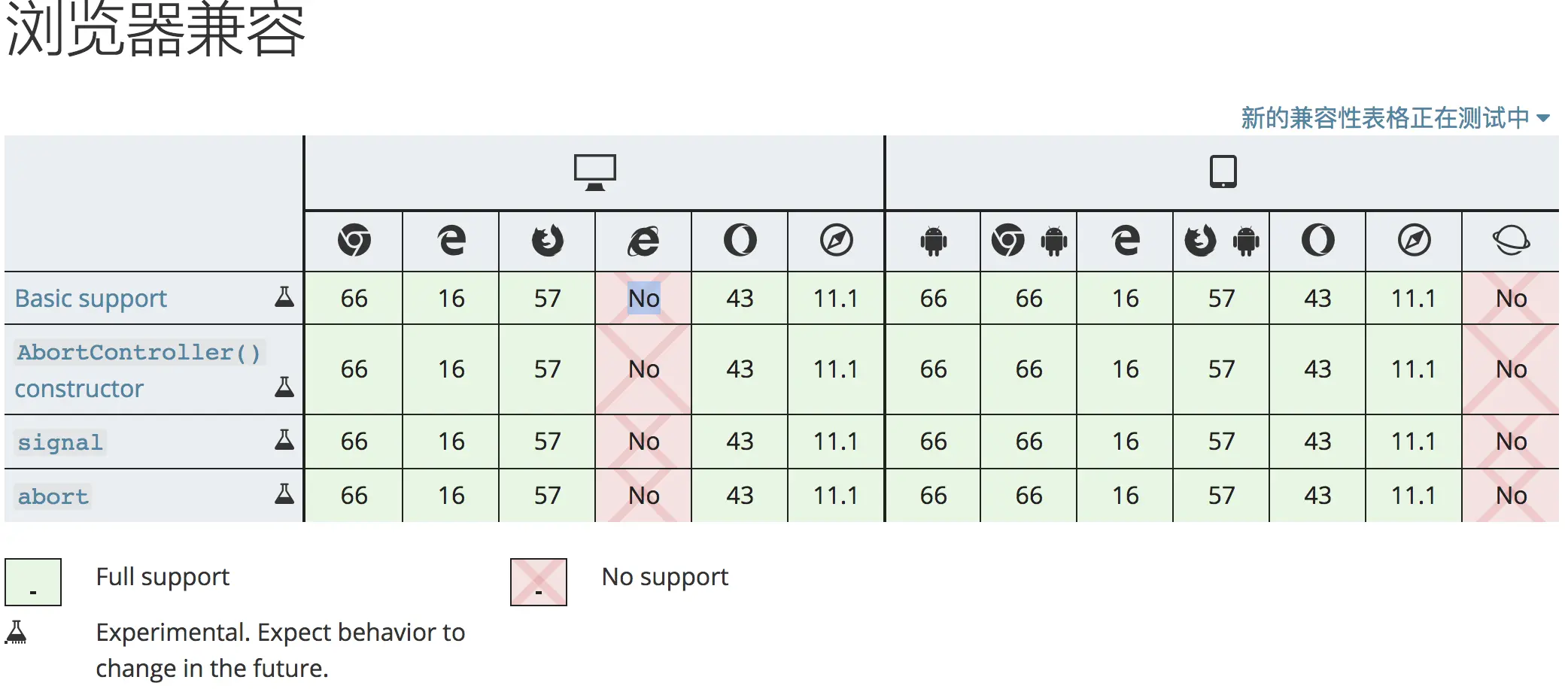 很明显,一目了然,能够很清晰的知道,采用这种方式可以手动终止 Fetch,但是可惜的是前端的新技术的通病, 浏览器支持力度, 从 MDN 上可以看到这个技术尚处于正在开发阶段。