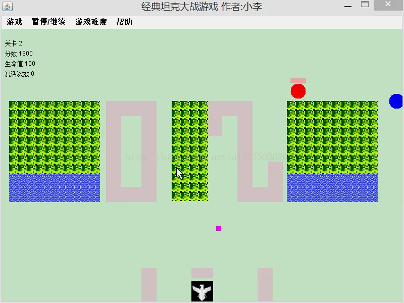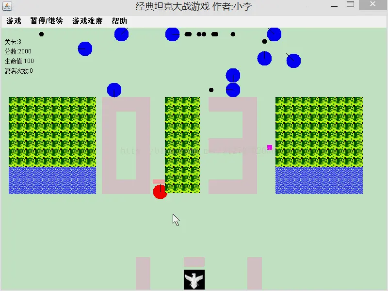 这是一个功能相对全的JAVA版坦克大战,界面绘制是通过JAVA的图形化用户界面完成的,包括了菜单界面和游戏界面。其中菜单界面可以供玩家选择重新开始游戏、暂停、继续、是否播放背景音乐、帮助等操作;游戏界面绘制了坦克、河流、草地、鹰碉堡等经典坦克场景,玩家在游戏界面操作坦克开始对战。