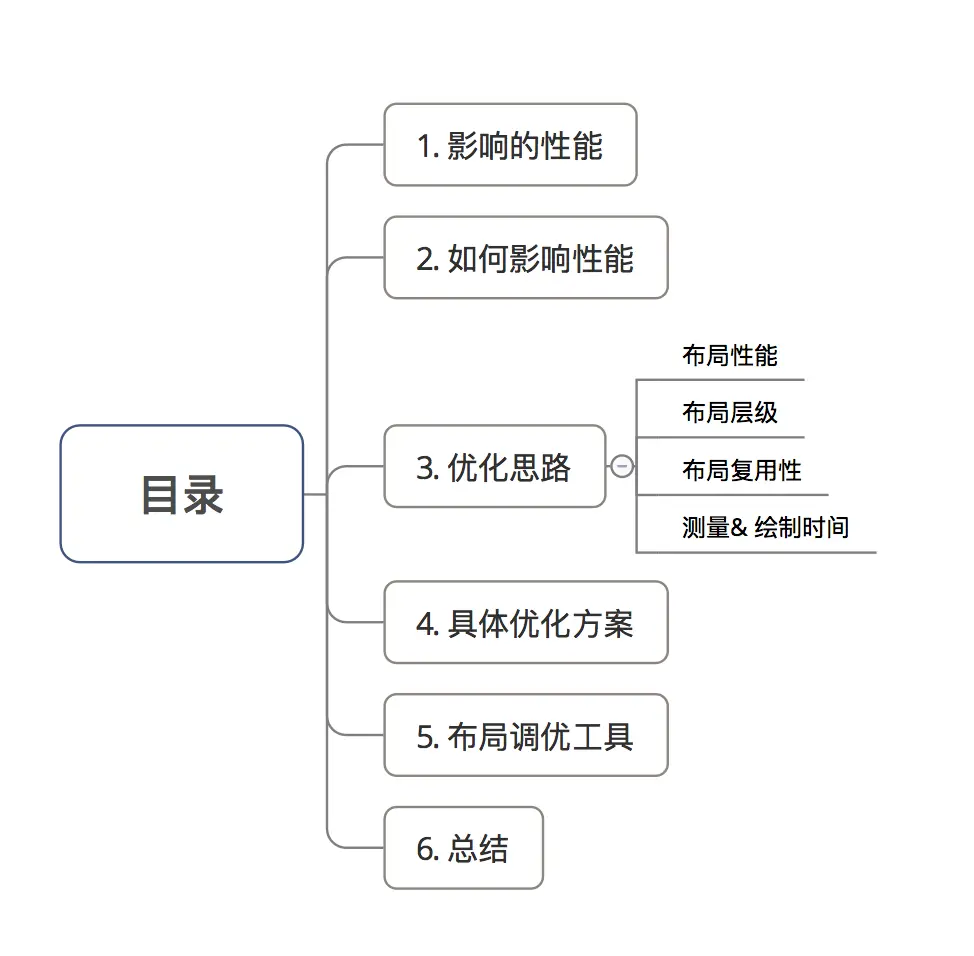 - 优化方向:布局性能、布局层级、布局复用性 和 测量 & 绘制时间