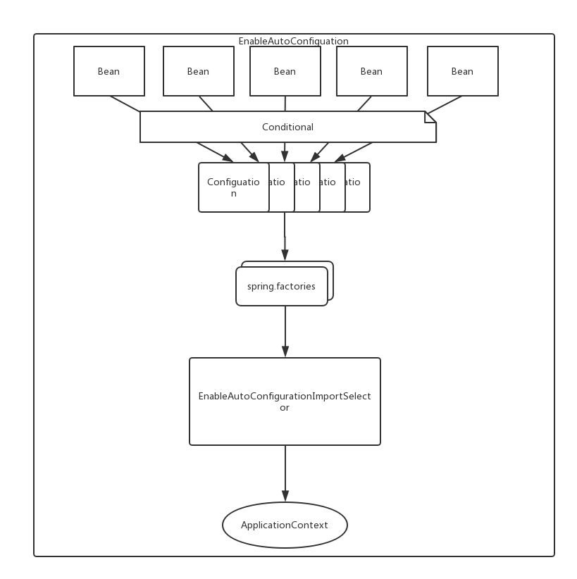 通过Spring 4的条件配置决定哪些bean可以被配置,将这些条件定义成具体的Configuation,然后将这些Configuation配置到spring.factories文件中,作为key: org.springframework.boot.autoconfigure.EnableAutoConfiguration的值,这时候,容器在启动的时候,由于使用了EnableAutoConfiguration注解,该注解Import的EnableAutoConfigurationImportSelector会去扫描classpath下的所有spring.factories文件,然后进行bean的自动化配置。