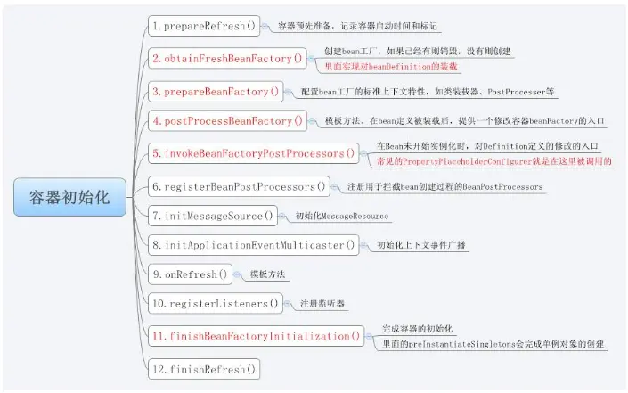 IoC容器的初始化就是含有BeanDefinition信息的Resource的定位、载入、解析、注册四个过程,最终我们配置的bean,以beanDefinition的数据结构存在于IoC容器即内存中。这里并不涉及bean的依赖注入,只是bean定义的载入。但有例外,在使用Ioc容器时有一个预实例化的配置,即bean定义中的设置了lazyinit属性,那么这个bean在Ioc容器初始化时就预先加载,不需要等到Ioc整个初始化后,第一次getBean时才会触发。其中refresh()启动对Ioc容器的初始化。